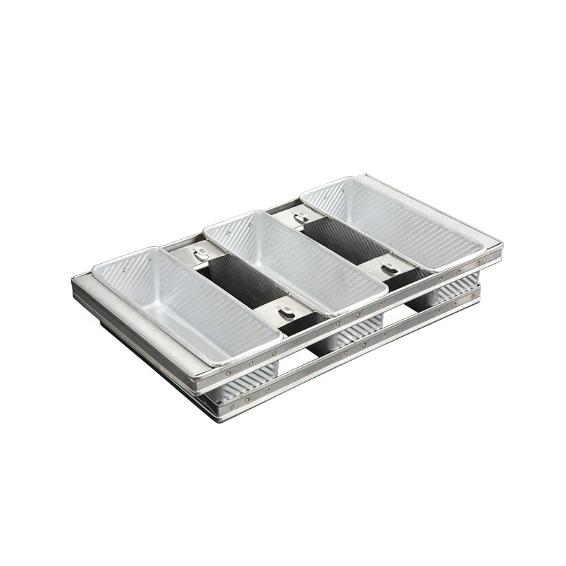 Assadeiras para pão de forma em aluminol com 03 canecas estampadas e estriadas e cinta superior, para acondicionamento e cozimento de massas alimentícias