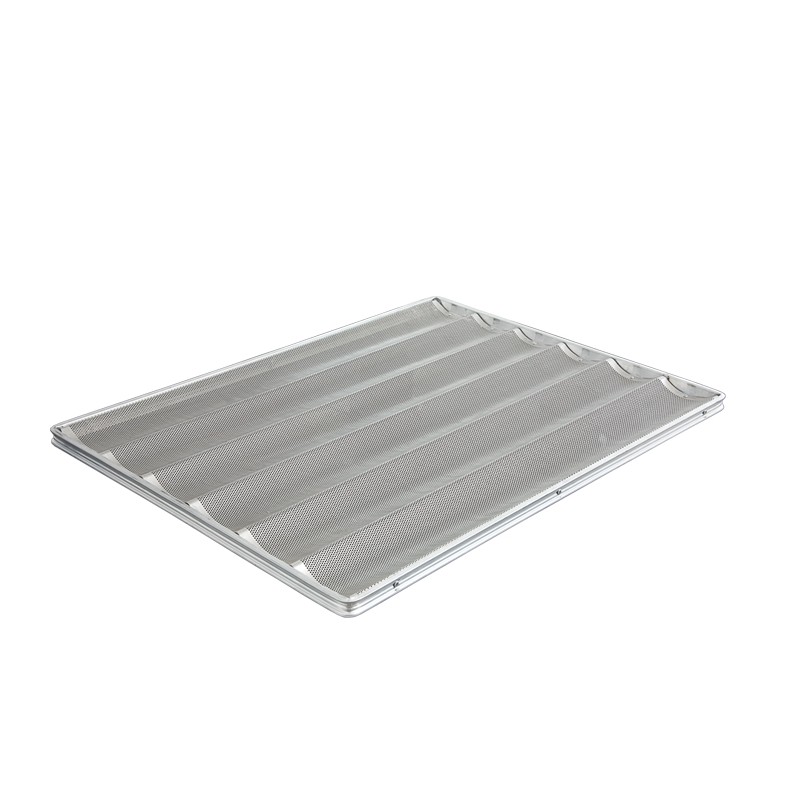Assadeira ondulada totalmente perfurada em alumínio com 06 canaletas longitudinais, engate para fornada de 30 pães franceses, para acondicionamento e cozimento de massas alimentícias