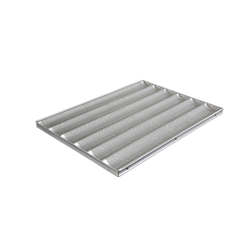 Assadeira ondulada totalmente perfurada em alumínio com 06 canaletas longitudinais, para fornada de 36 pães franceses, para acondicionamento e cozimento de massas alimentícias.