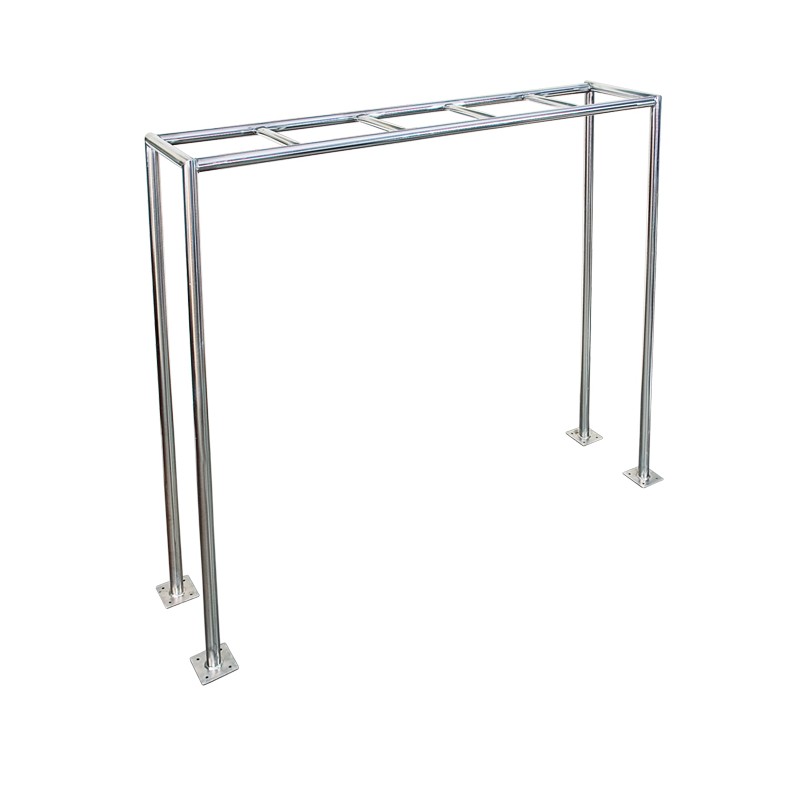 Estrutura tubular construído totalmente em aço inox 304 pés Ø 2″ parede 3.0 mm e travesas superiores em Ø 1 1/2″ parede 2,5 mm, sapatas para fixação no chão em chapa 5 mm, para suporte de peças de carnes e frios.