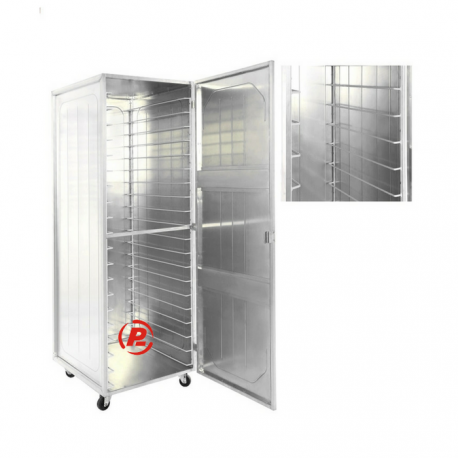 Estufa em alumínio polido modelo “C” para bandejas com dimensões 40 cm x 60 cm, com 20 divisões em trefilado, 01 porta, puxador, rodízios de borracha, para acondicionamento e fermentação de massas alimentícias
