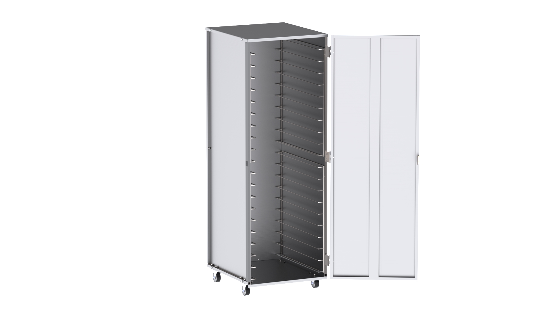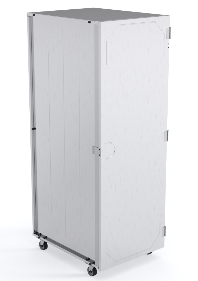 Estufa em aço inox 304 modelo “E” para bandejas com dimensões 58 cm x 68 cm, com 20 divisões em trefilado, 01 porta, puxador, rodízios de borracha, para acondicionamento e resfriamento de massas alimenticias