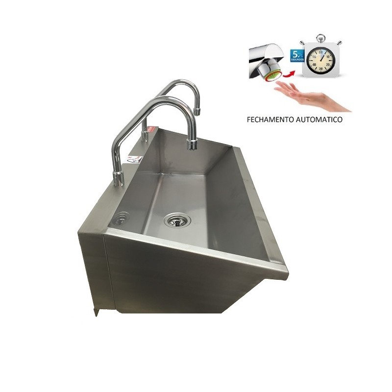 Lavatório de mãos inteiriço em aço inox 304, chapa com espessura de 1,00 mm, com 01 cuba e 02 bicas com acionamento por registro de esfera TIME OFF , tempo regulável, para saída de água.