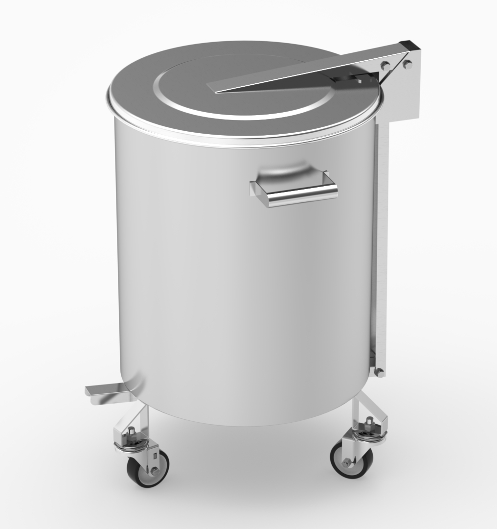 Cesto de lixo em aço inox 304 com espessura de 0,80 mm, tampa basculante repuxada, fundo em espessura 1,20 mm, pedal com estrutura em aço inox, rodízios Ø 3″ de borracha, capacidade 40 litros, para transporte de detritos.