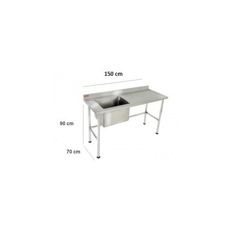 Mesa com 01 cuba lateral esquerda  distanciada à 0.45 cm da borda da mesa ao centro da cuba, construída totalmente em aço inox 304 espessura de 1,20 mm, pés e contraventamento em tubo em aço inoxidável 304, sapata regulável em borracha e respaldo.