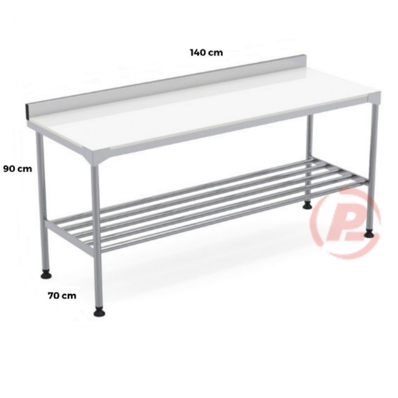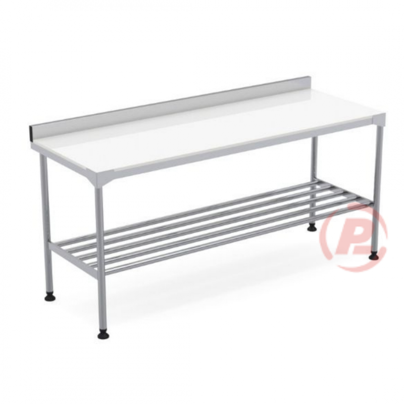 Mesa Tampo Altileno espessura 1,5 cm, construída totalmente em aço inox 304, com apoio da placa, pés e contraventamento em tubo em aço inoxidável, sapata regulável em borracha, grade inferior tubular e respaldo.