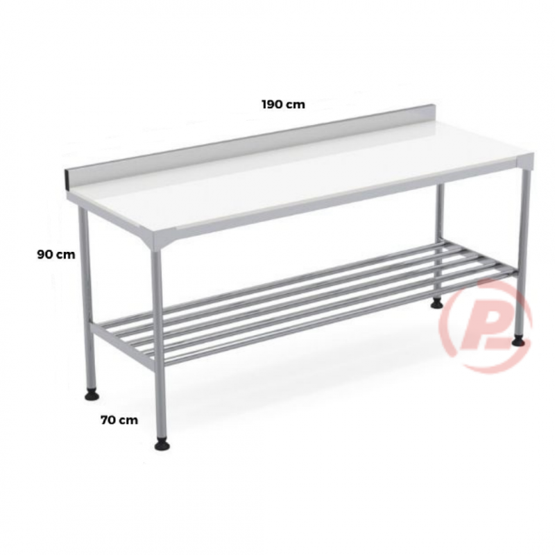 Mesa Tampo Altileno espessura 1,5 cm, construída totalmente em aço inox 304, com apoio da placa, pés e contraventamento em tubo em aço inoxidável, sapata regulável em borracha, grade inferior tubular e respaldo.