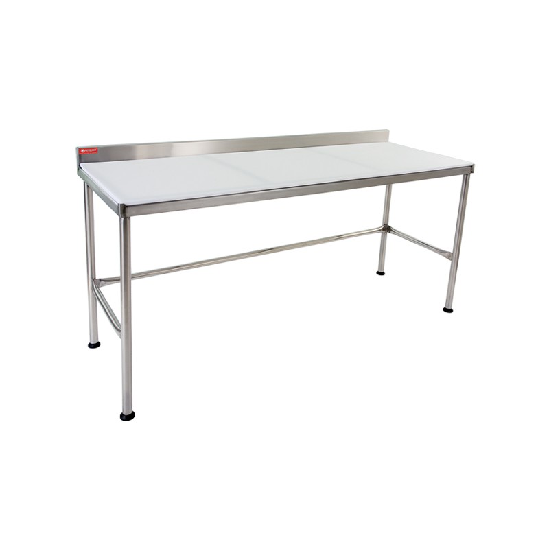 Mesa Tampo Altileno espessura 1,5 cm, construída totalmente em aço inox 304, com apoio da placa, pés e contraventamento em tubo em aço inoxidável, sapata regulável em borracha e respaldo.