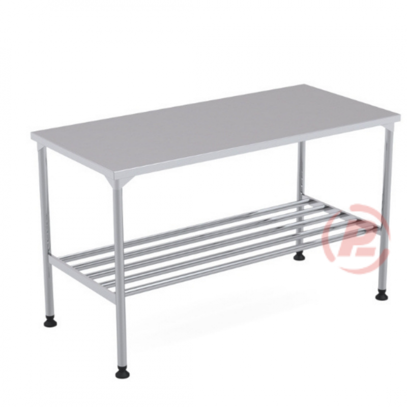 Mesa Tampo Liso construída totalmente em aço inox 304, com espessura de 1,20 mm no tampo, pés e contraventamento em tubo em aço inoxidável, sapata regulável em borracha e grade inferior tubular.