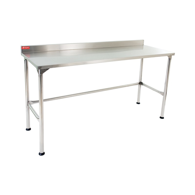 Mesa Tampo Liso construída totalmente em aço inox 304, com espessura de 1,20 mm no tampo, pés e contraventamento em tubo em aço inoxidável, sapata regulável em borracha e respaldo.
