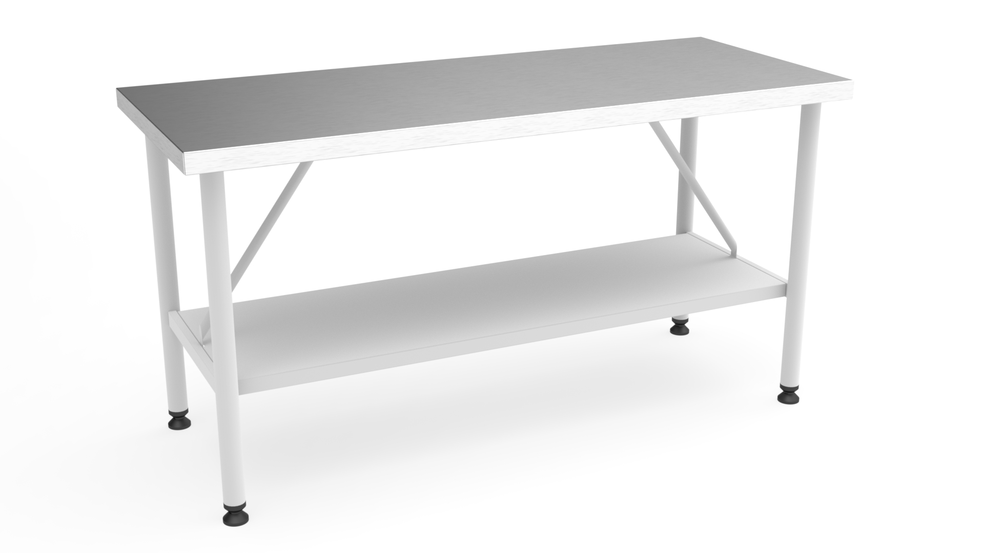 Mesa tampo liso em aço inox 430 com espessura 1,50, estrutura em ferro pintado, pés com tubo Ø 2″, prateleira inferior com espessura 1,20 mm, pode ser montada e/ou desmontada e sapatas reguláveis em borracha.
